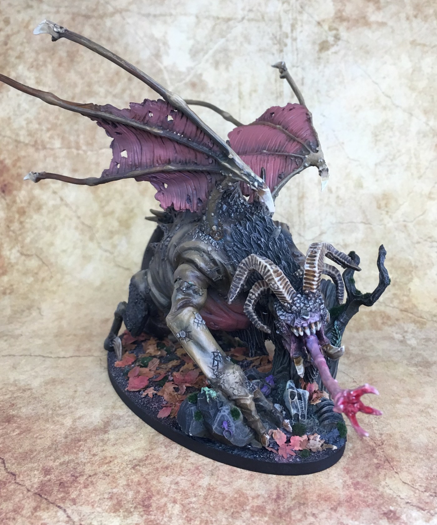 What a pain this was. Assembly was like trying to fit an orc in an elven dress. The length of the torso meant that the warped resin needed a hefty amount of greenstuff. I wanted to use my airbrush as much as possible on the large surface of the muscled torso, which meant I had to assemble the forelimbs and the wooden trunk seperately, in order to be able to airbrush the stomach and lower parts. This turned out to be a really bad idea, as the forelimbs and tree trunk alligned poorly with the torso, once again needing loads of greenstuff. Similarly I also wanted to paint the wings before attaching them and I was actually finishied painting the torsy when someone (wisely) suggested to magnetize the wings, again more drilling and greenstuff, resulting in re-painting parts of the torso. In retrospect all this should have been done before painting.
