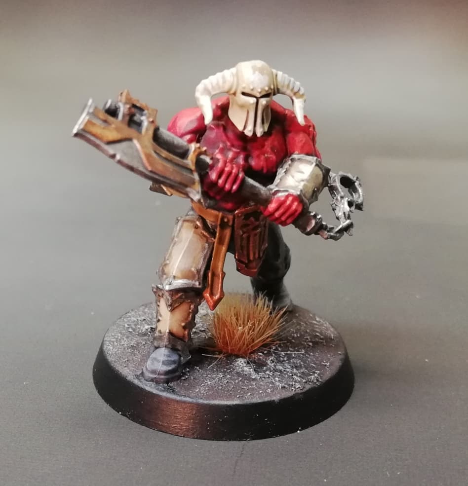 After priming with Wraithbone I applied a heavy layer of Flesh Tearer Red contrast paint. I guess it does what its supposed to do, pile up to create darker tones in the recesses, much like a shade and leave a thinner transparent layer on the raised ares. For skin tones, contrast color appears to be a very good way of producing fast tabletop results. Once the contrast had dried, I did a broad highlight on raised areas with Evil Sunz Scarlet. Overall I’m fairly pleased.