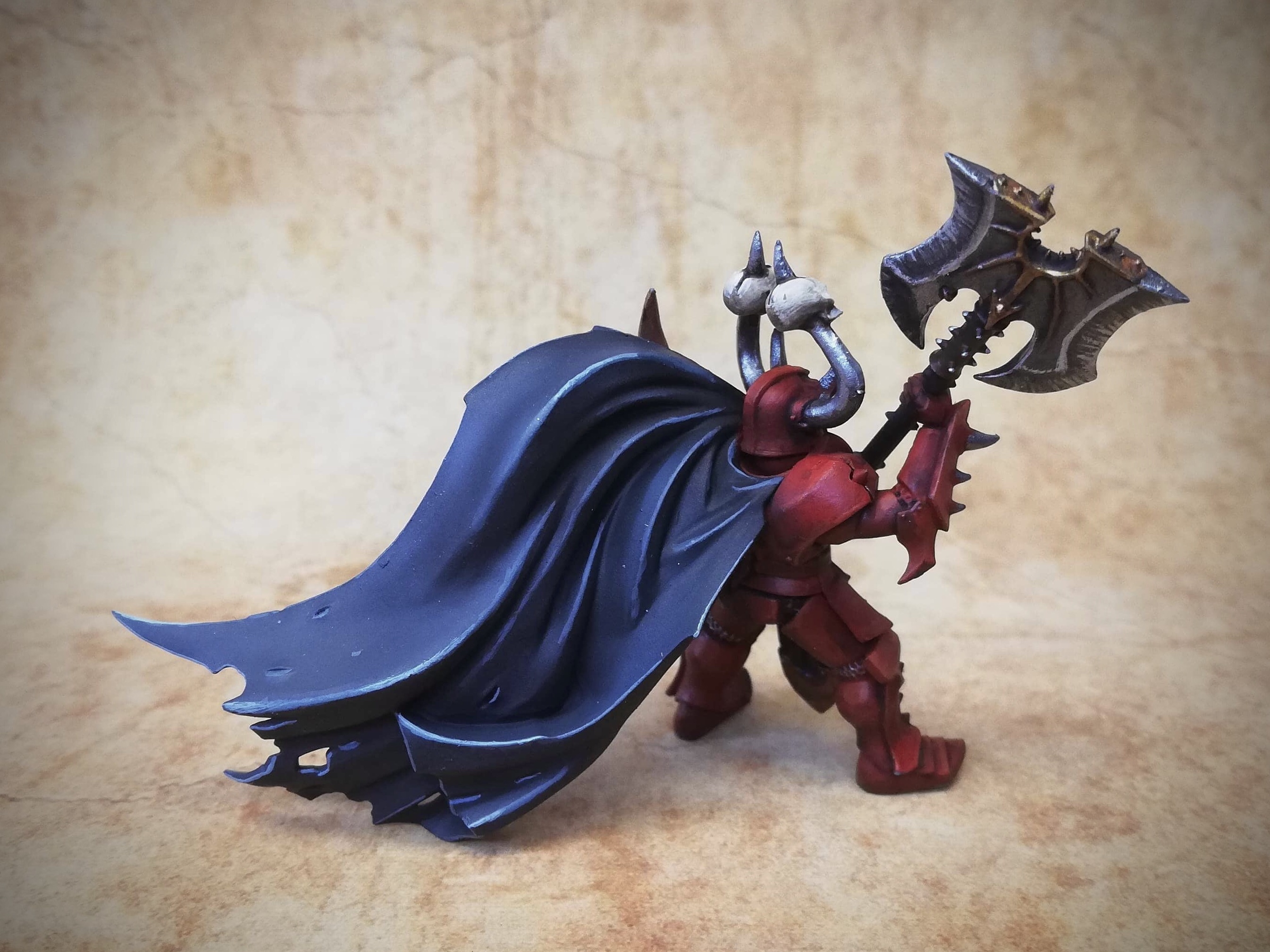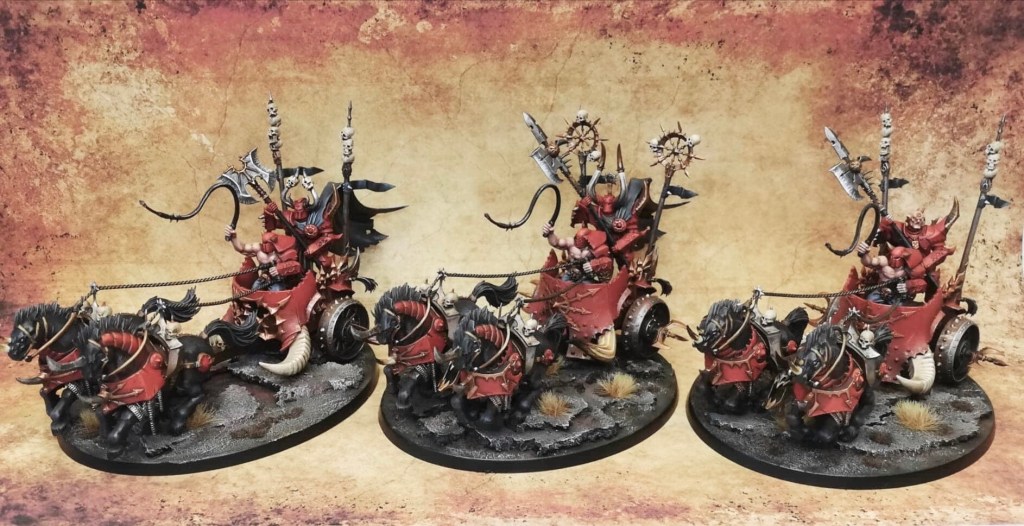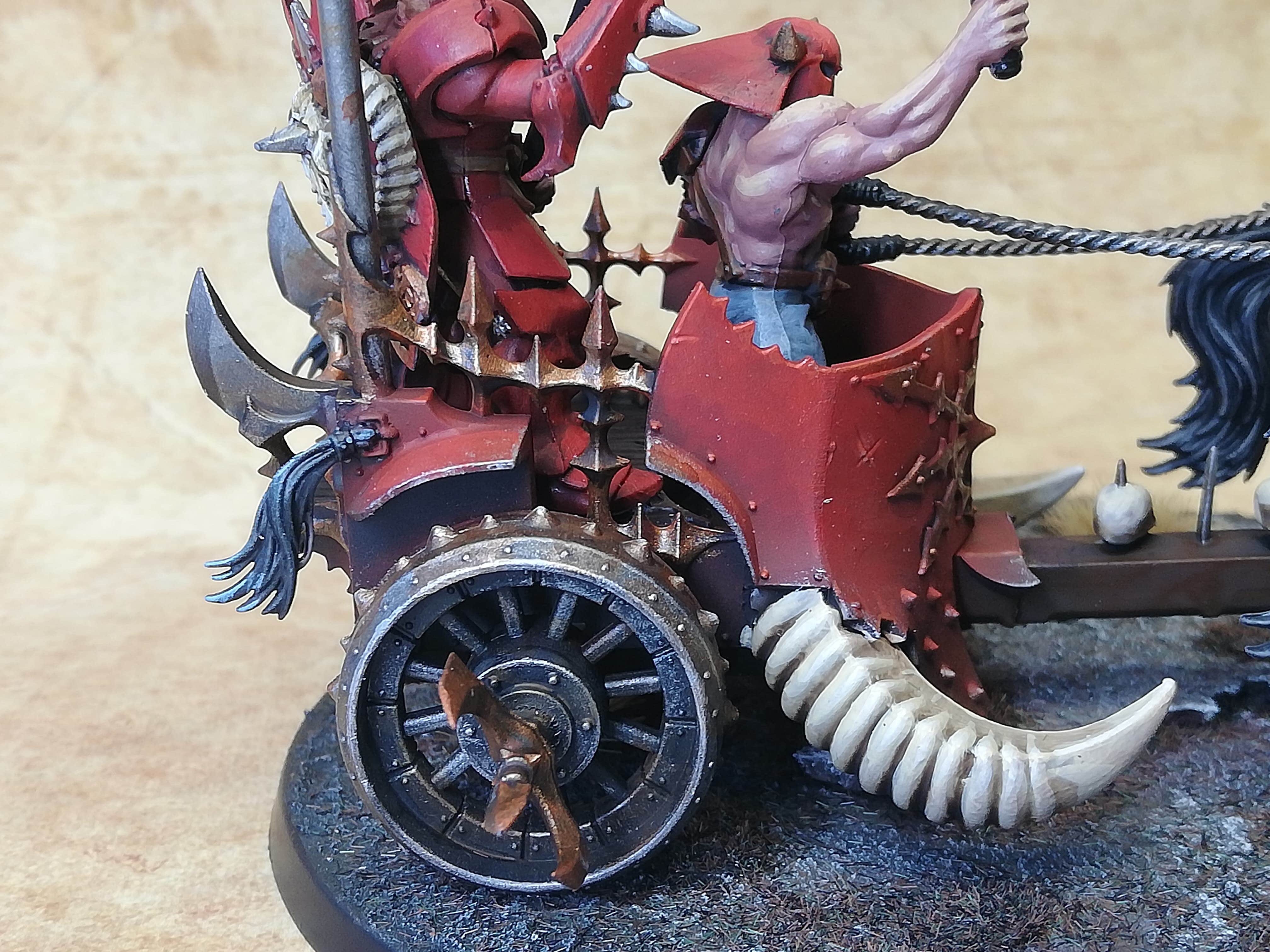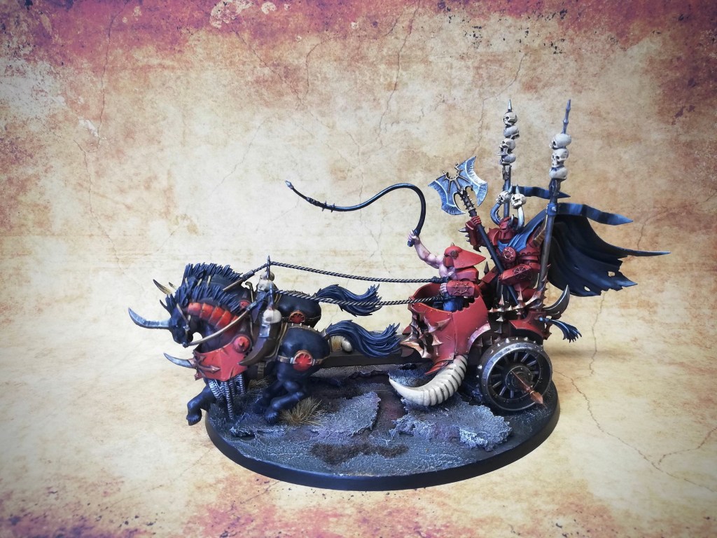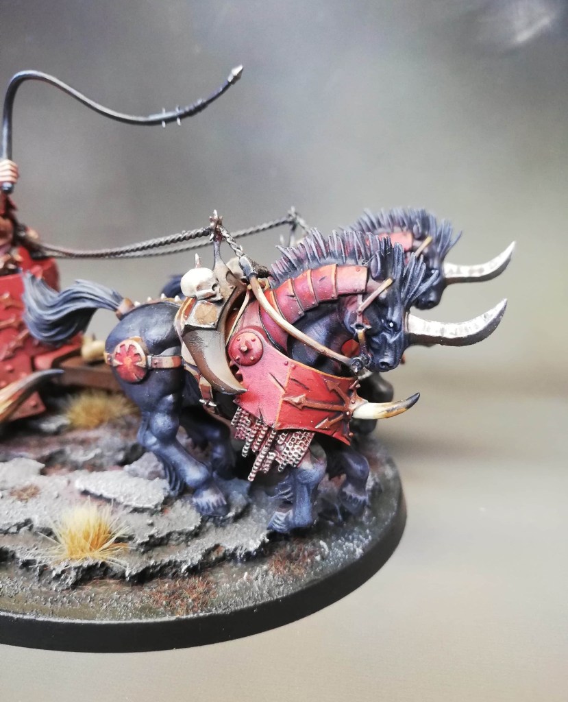 Not one, but three chariots, have been requisitioned by my red master to accompany his hellish army into battle. The chariots are heavy ironclad constructs drawn by furious beasts from the darkest plains of the chaos wasteland. The chariot is driven by a brutish horse master and behind him a dark champion stands, wielding an insidious poleaxe. With such a large and also complex model, the challenge is to get a consistent look across the different model parts, but also to focus on the parts that stand out, i.e. the parts that are seen at first glance from across the battlefield, then do a simpler paintjob on other less visible parts. Below, I will go through how I painted some of the more interesting bits.