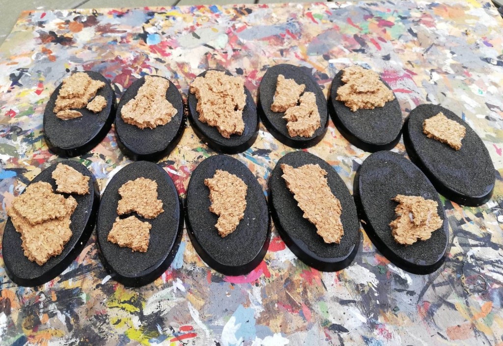 The chariots are based on quite large oval bases and such a large base needs something more than just a simple texture effect. Oh – I remember when bases where square and no more than 50 by 50 millimeters at the most! How things have changed. Mostly for the better though, as I admittedly prefer the look of round bases (there I said it!). Anyways, pieces of thin cork sheet about 2-3 mm thick, are glued on in layers to create some rocky plateaus. The cork is painted black (black primer) and then Stirland Mud is added. Be careful when doing the black undercoat and make sure all cracks in the cork are completely covered. At least two layers are needed.