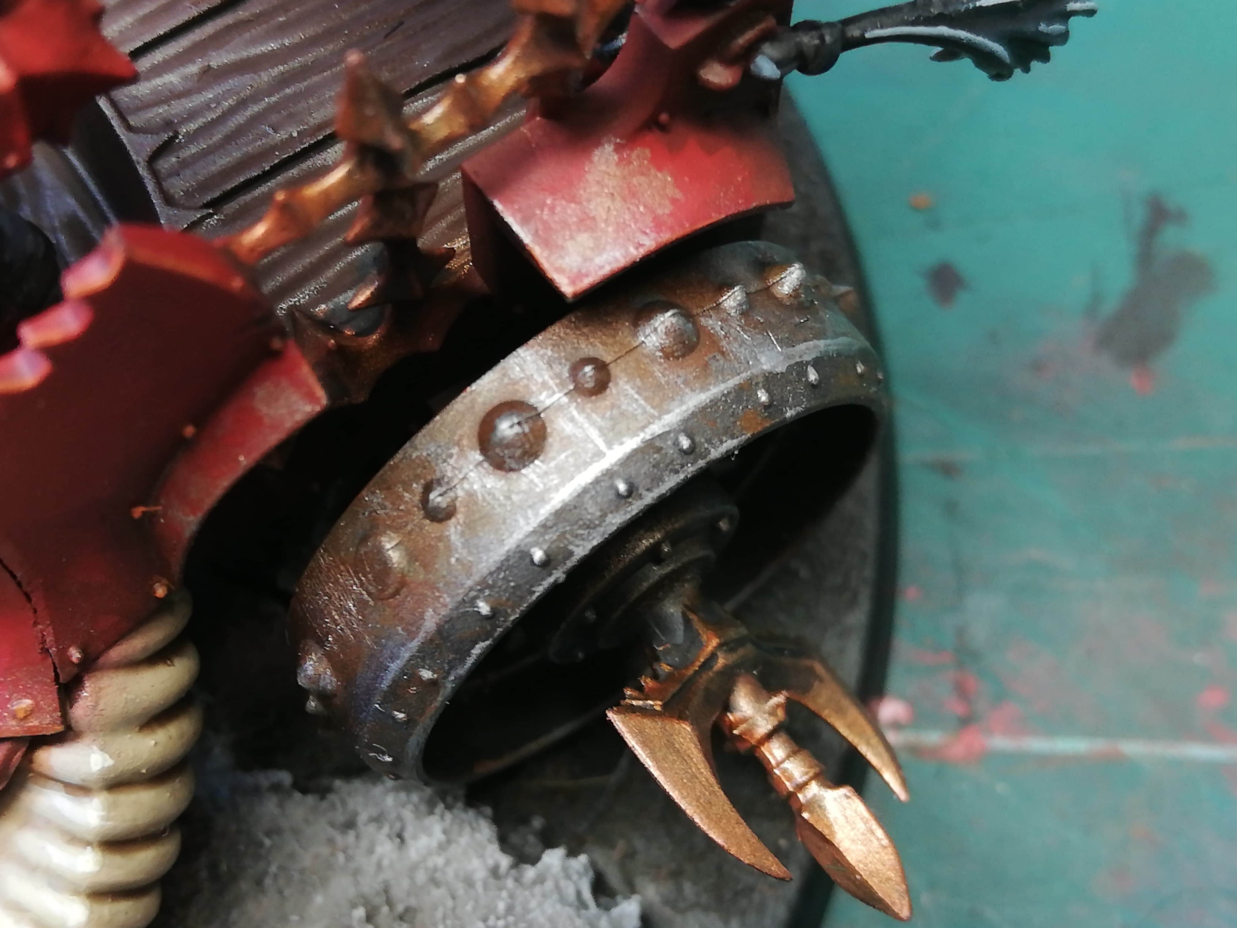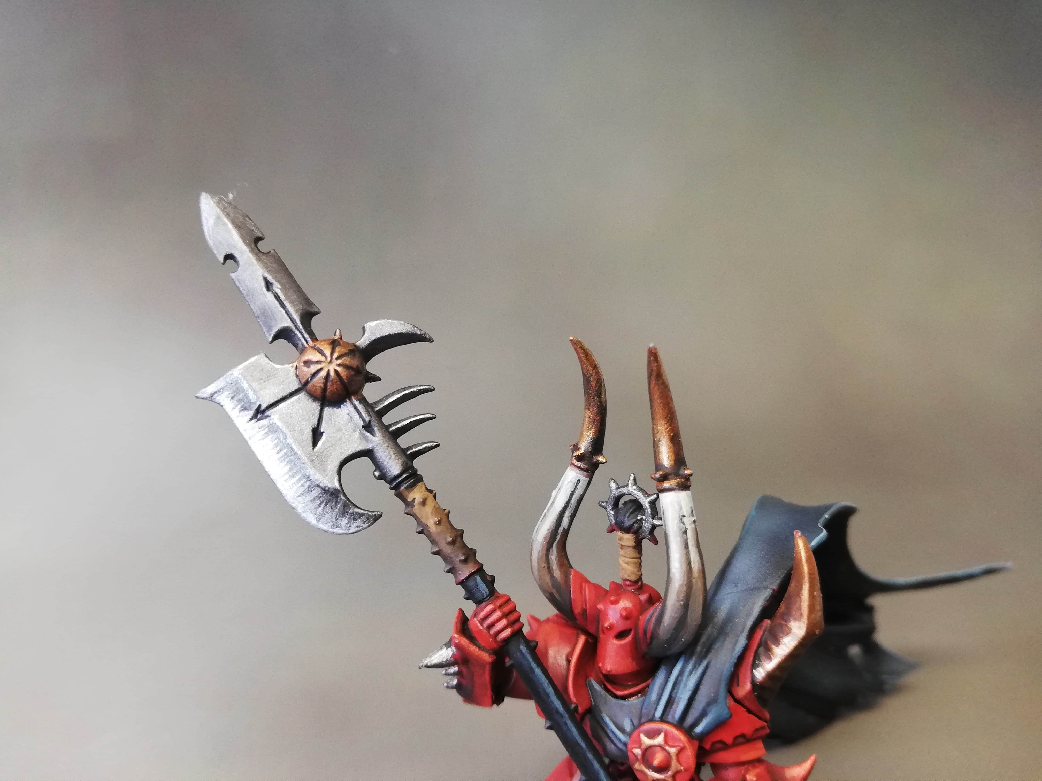 The weapons are based with Leadbealcher and Hashut Copper, then washed with Nuln Oil. For an interesting effect on the blade edges I messed about with steaks of dark and bright metallic tones, which I think adds a worn but also vibrant effect to the blade edges. I think I will doing this on future models as well.