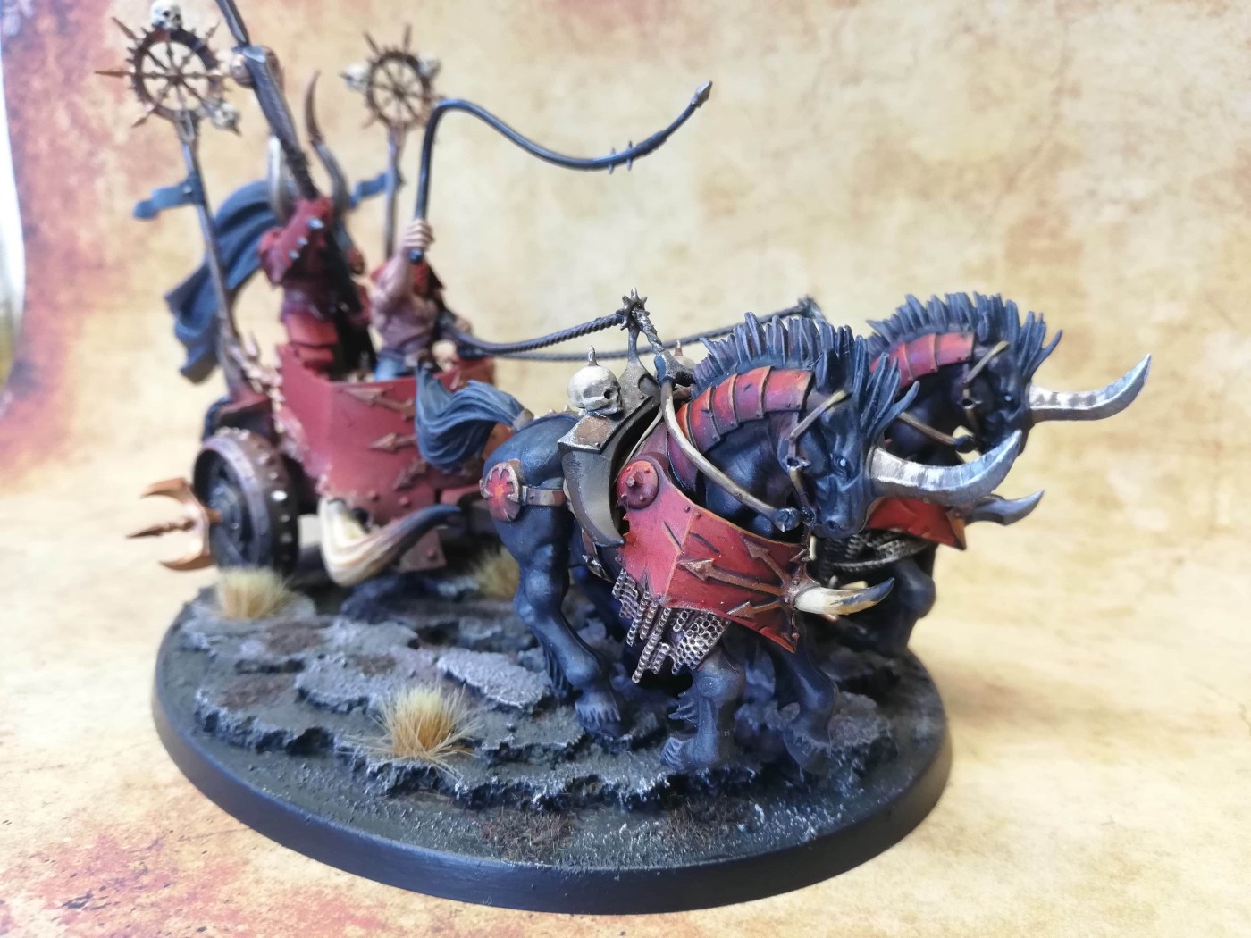 Not one, but three chariots, have been requisitioned by my red master to accompany his hellish army into battle. The chariots are heavy ironclad constructs drawn by furious beasts from the darkest plains of the chaos wasteland. The chariot is driven by a brutish horse master and behind him a dark champion stands, wielding an insidious poleaxe. With such a large and also complex model, the challenge is to get a consistent look across the different model parts, but also to focus on the parts that stand out, i.e. the parts that are seen at first glance from across the battlefield, then do a simpler paintjob on other less visible parts. Below, I will go through how I painted some of the more interesting bits.