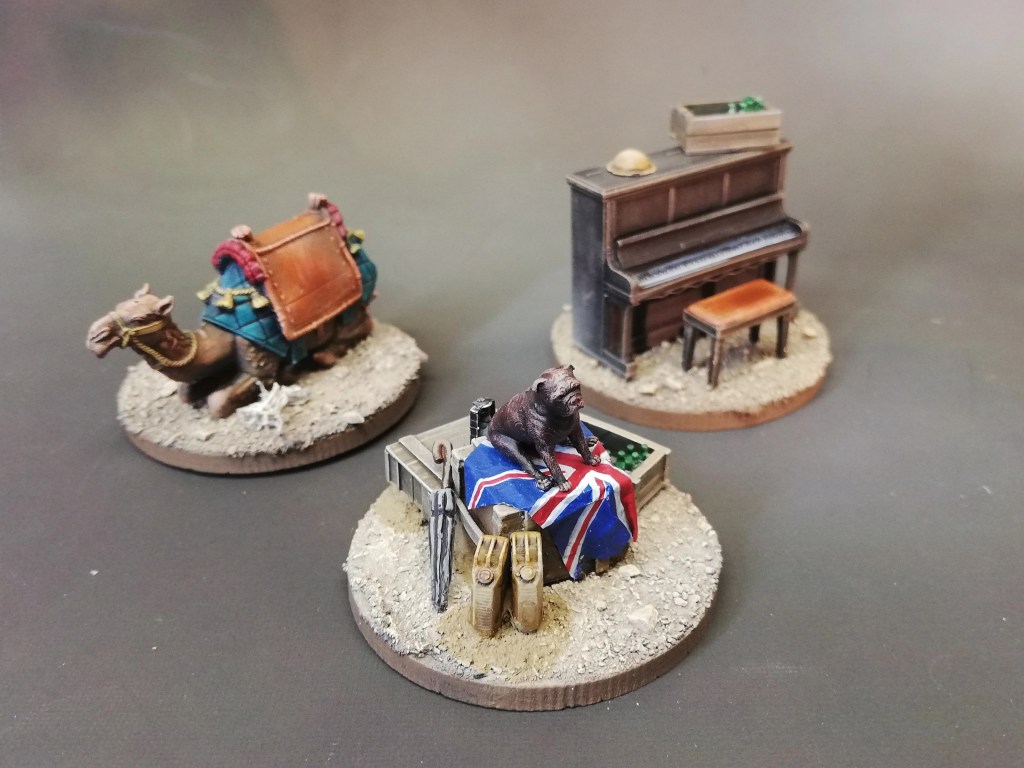 For the British troops stationed in North Africa I’ve gone a bit loopy as I wanted to make them desert, but distinctly different from their German counterparts. I tried to come up with the most stereotypical items that Monty would bring to war and figured it would be alcohol, music and of course and umbrella. Additionally, as with the Soviet example above, I have also included the Union-Jack with a small vicious dog guarding it.