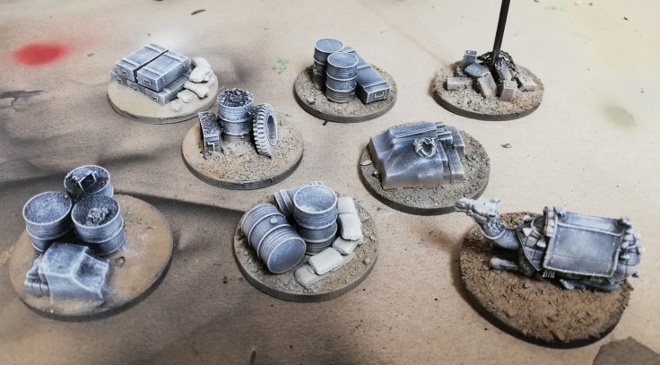 Where possible I try to paint the individual parts of the Jump-off Points prior to assembly. However, for parts such as crates and oil-drums, that need to be placed on the ground level, I recommend to put those down first and then add the basing material like sand, rocks, etc. afterwards. This ensures that the parts are firmly bonded into the ground and not appear to be “hovering” a few millimeters off the ground. I spent quite a lot of time moving bits around to get a design that can looks balanced from all angles. As a rule of thumb, I build them in the overall shape of a pyramid, placing few and small items near the edge of the base, with the larger items like barrels and crates in the center.