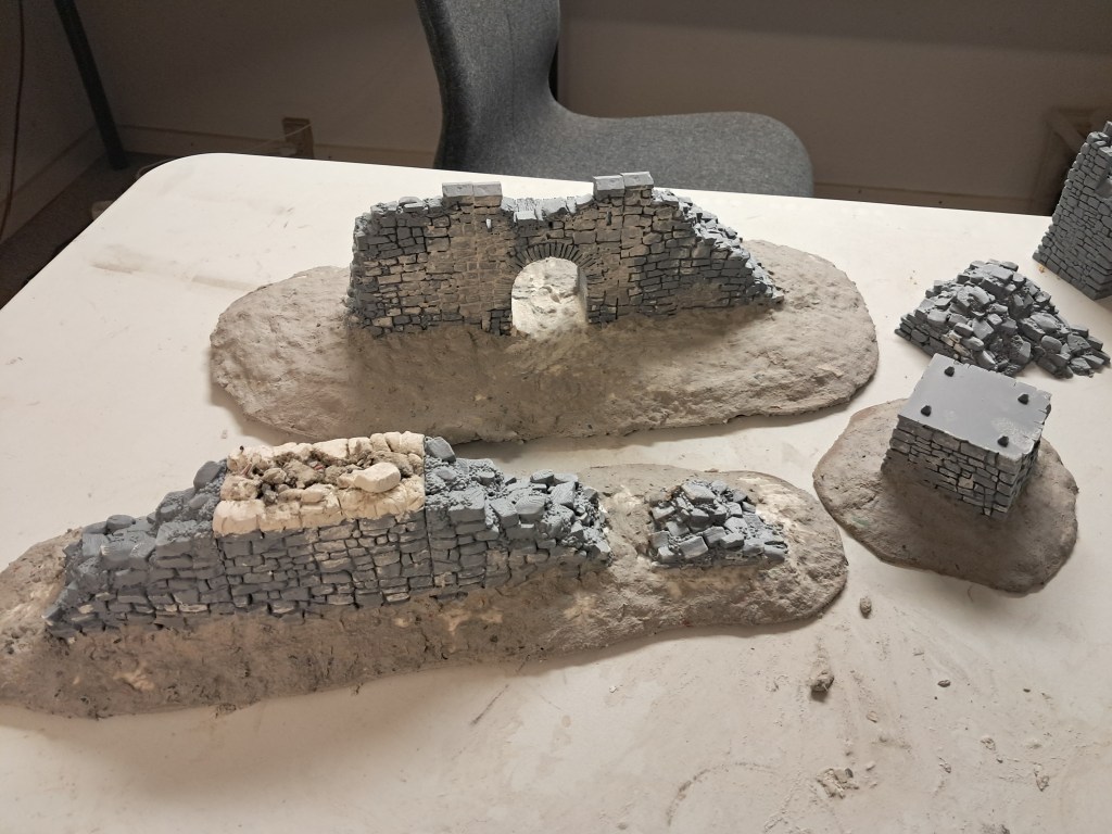 I decided to glue the pieces together and base them on a piece of 3mm mdf board with added eps foam to create a smooth and natural transition into the surrounding terrain. I think most terrain pieces look better based, except for smaller pieces of scatter terrain. All the wall sections have a bit of wooden flooring and I wanted it to look even more ruined. Quite possibly local farmers would pillage the ruins, using the stones in walls or as road fill, so there really shouldn’t be much left in most places. To create a collapsed wall I used a part of the 3d files that is meant to be a foundation and it has a flat top, where you can stack a second wall on top of. Thus, I had to do a bit of work to create a natural looking top. For this I used DAS clay, which is a sculpting clay that dries in room temperature overnight, but you could use Milliput or similar.